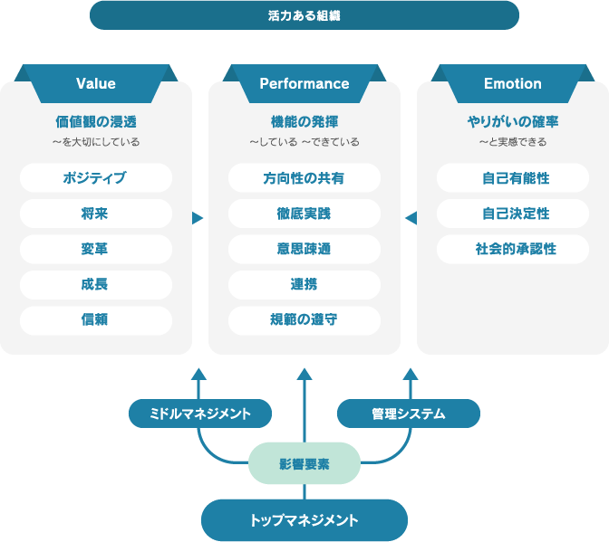 組織の現状を「機能」「価値観」「やりがい」の各側面より、多面的に捉えます。