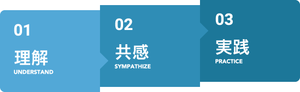 ミッション、ビジョン、バリューの浸透には、3ステップがあり、実践・定着までの各ステップにおいて必要な施策が変わってきます。