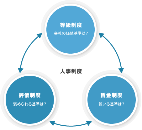 賃金制度だけを変えても問題の解消にはつながりません。人事制度においては等級制度・評価制度・賃金制度はそれぞれ強く連関しており、これらを総合的にとらえ、構築することが問題の解消につながります。