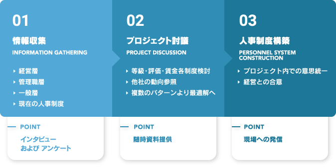 人事制度のパッケージを販売しているわけではありません。各社の置かれた状況、人材の特徴、これまでの人事制度の問題状況を踏まえて構築します。 人事制度には流行も存在します。これらを無視することはありませんが、適切なものは何かについてお客様と共に考えていきます。