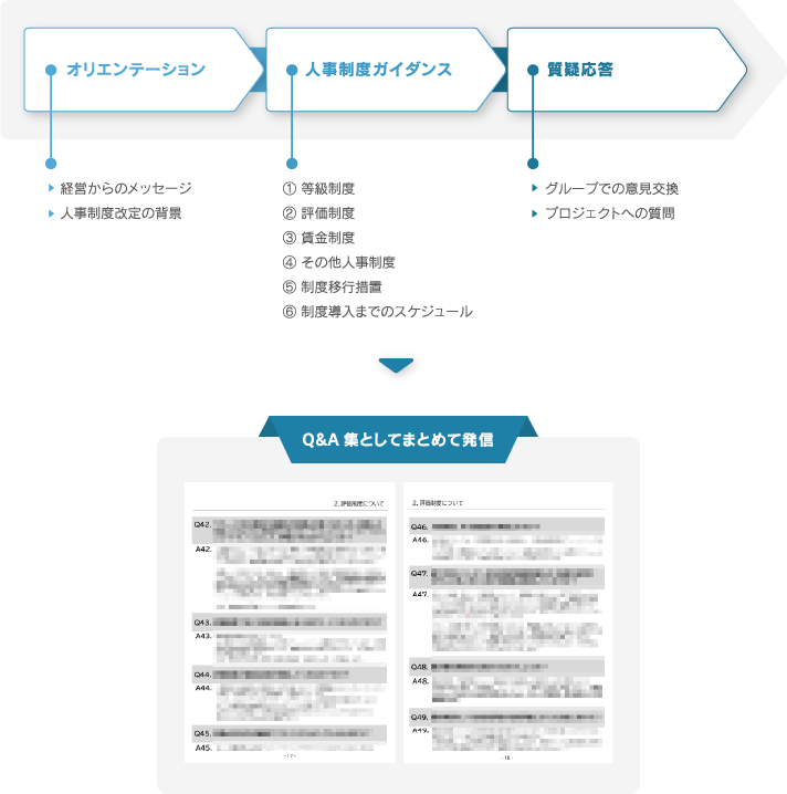 構築した人事制度について、その内容をそのまま説明するだけではなかなか理解が進みません。作成した人事制度ハンドブックを活用し、人事制度改定の背景や、現状の問題意識の共有などを説明会のプログラムに取り入れながら、効果的な説明会の実施を支援します。