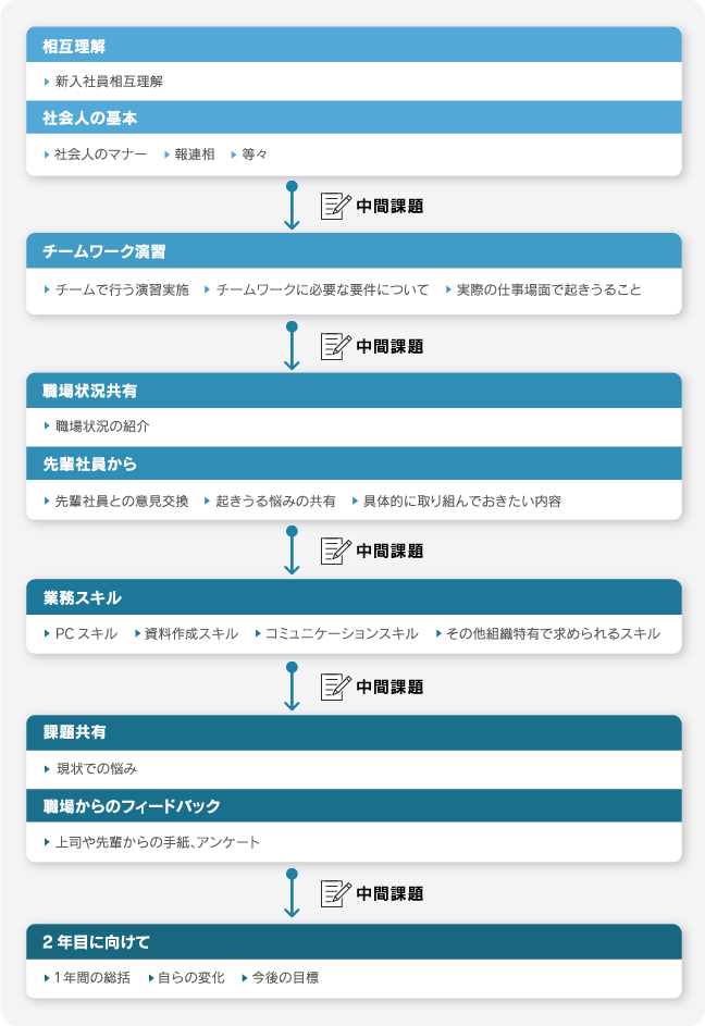 新入社員がしっかりと定着し、意欲やスキルを向上させながら一人前になるまでの3年間、しっかりとみていくことをお勧めしています。