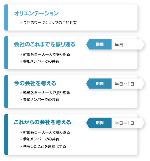経営幹部として必要な様々な要素はもちろん、経営幹部間の信頼関係構築など、個々の会社の幹部にとって必要な研修を全てオリジナルで設計し、実施します。