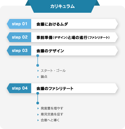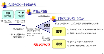 会議をどのように設計するか、様々な意見をどのように扱い意見交換を促すか、などの会議の進め方の基本を学びます。
