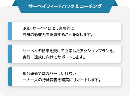 より正確に現状を認識するためにも、サーベイの読み取り方をレクチャーするとともに、世の中の変化に対応したリーダーシップの発揮の重要性をご理解いただきます。