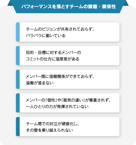 1対1のコーチングでは解決しきれない問題を、チーム及びその関係性にダイレクトにアプローチすることで、チームに変化を与えます。
